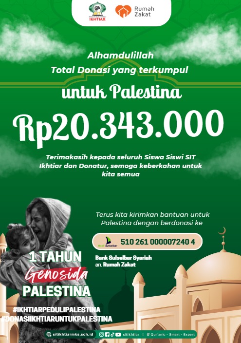 “Semoga sumbangan atau donasi dari siswa dan orang tua SIT Ikhtiar Unhas mendapat berkah dari Allah SWT dan semoga dapat meringankan beban saudara-saudara kita di Palestina yang dalam setahun terakhir ini terancam di genosida oleh Israel. Semoga Palestina dapat terlepas dari belenggu penjajahan Israel sehingga dapat menciptakan kedamaian di Timur Tengah,” pungkasnya.