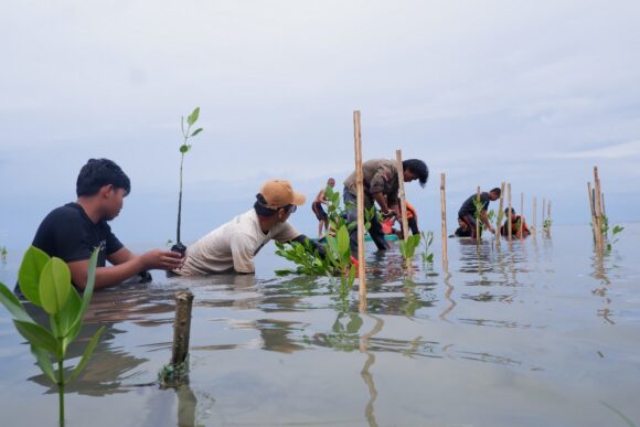 Puluhan relawan, air laut sebatas betis, tekun menanam 2.000 bibit mangrove, Sabtu, 10 Mei 2025.