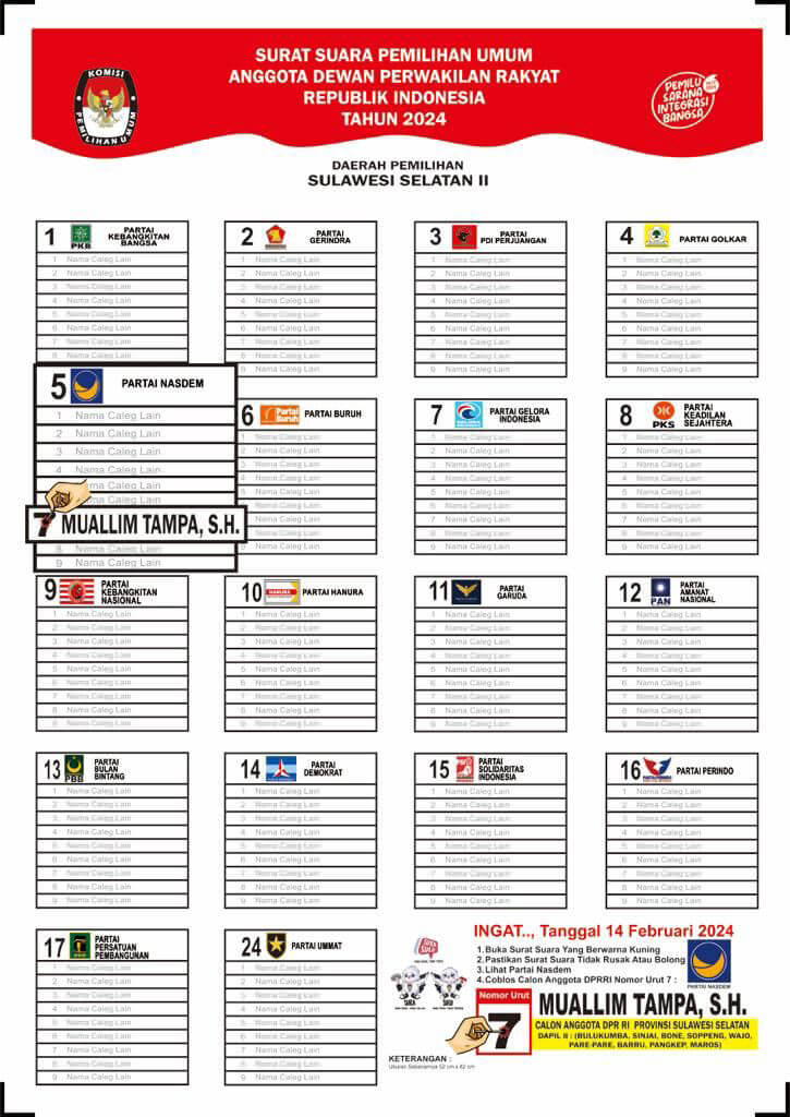 Hasil survei itu, menempatkan elektabilitas caleg DPR RI Partai NasDem Nomor Urut 7, Muallim Tampa tembus 10 besar dari ratusan caleg DPR RI 2024 di dapil Sulsel 2. Elektabilitas Muallim Tampa di angka 4,17%.
