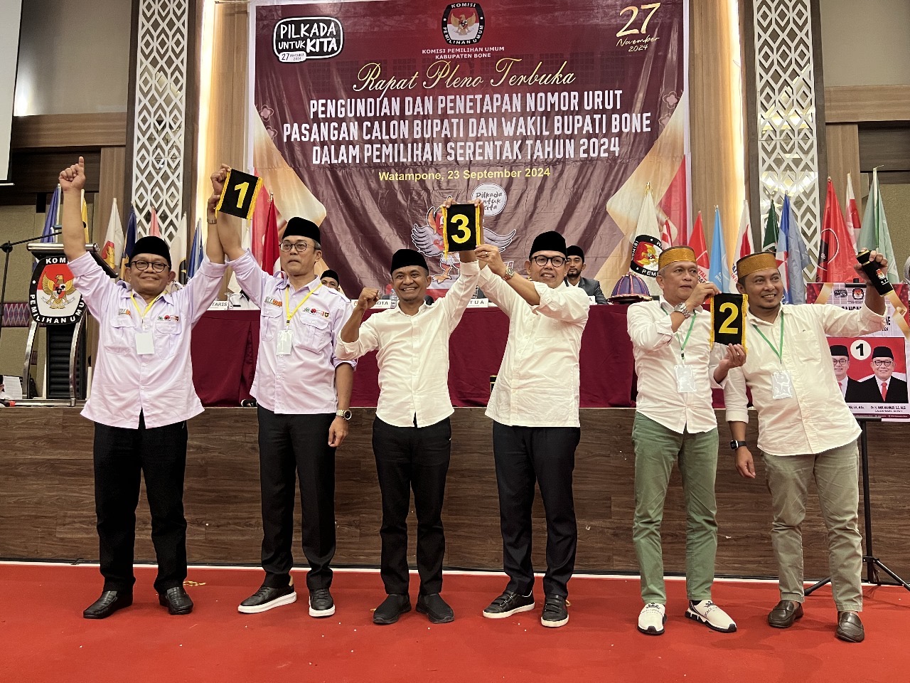 Pembukaan pleno terbuka dimulai pukul 14.00 Wita dan dilanjutkan dengan pembacaan tata tertib. Pengundian dilakukan sesuai nomor antrean yang diambil oleh Calon Wakil Bupati masing-masing pasangan sesuai kehadiran saat mendaftar ke KPU Bone. Berdasarkan antrean tersebut, Calon Bupati masing-masing pasangan calon mengambil nomor urut.